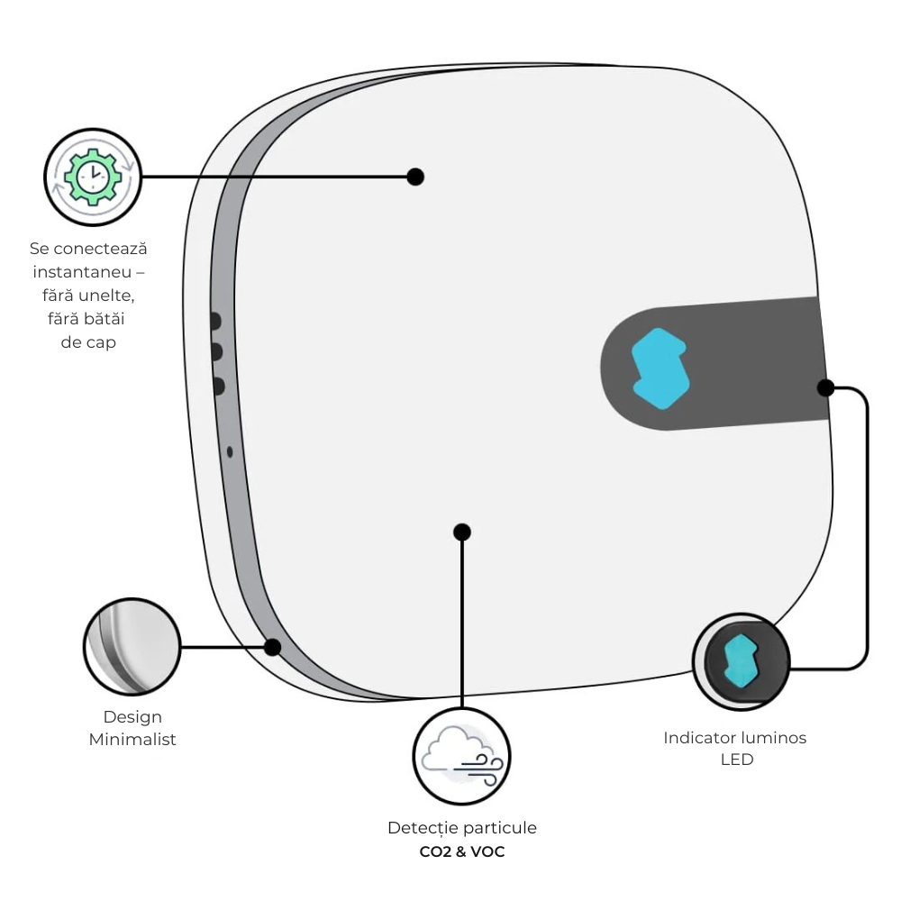 Urmărește calitatea aerului din interior și oferă recomandări pentru îmbunătățire.